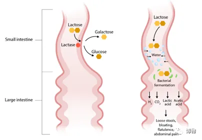 左为乳糖酶正常的肠道,右为乳糖酶缺乏的肠道