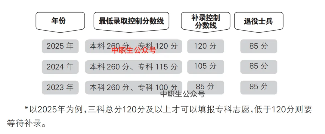 3+证书语数英三科总共450分,考多少分才能填志愿呢? 以2025年为例,想要参与网上志愿填报的考生需达到本科260分/专科120分的成绩门槛。如果分数未能达到120分,考生则无法进行志愿填报,需要等待后续的志愿征集。