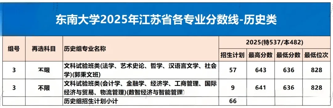 2025年东南大学2025年历史类招生共计66人,按照文科试验班类进行招生,最高分643分,最低分636分,最低位次828.