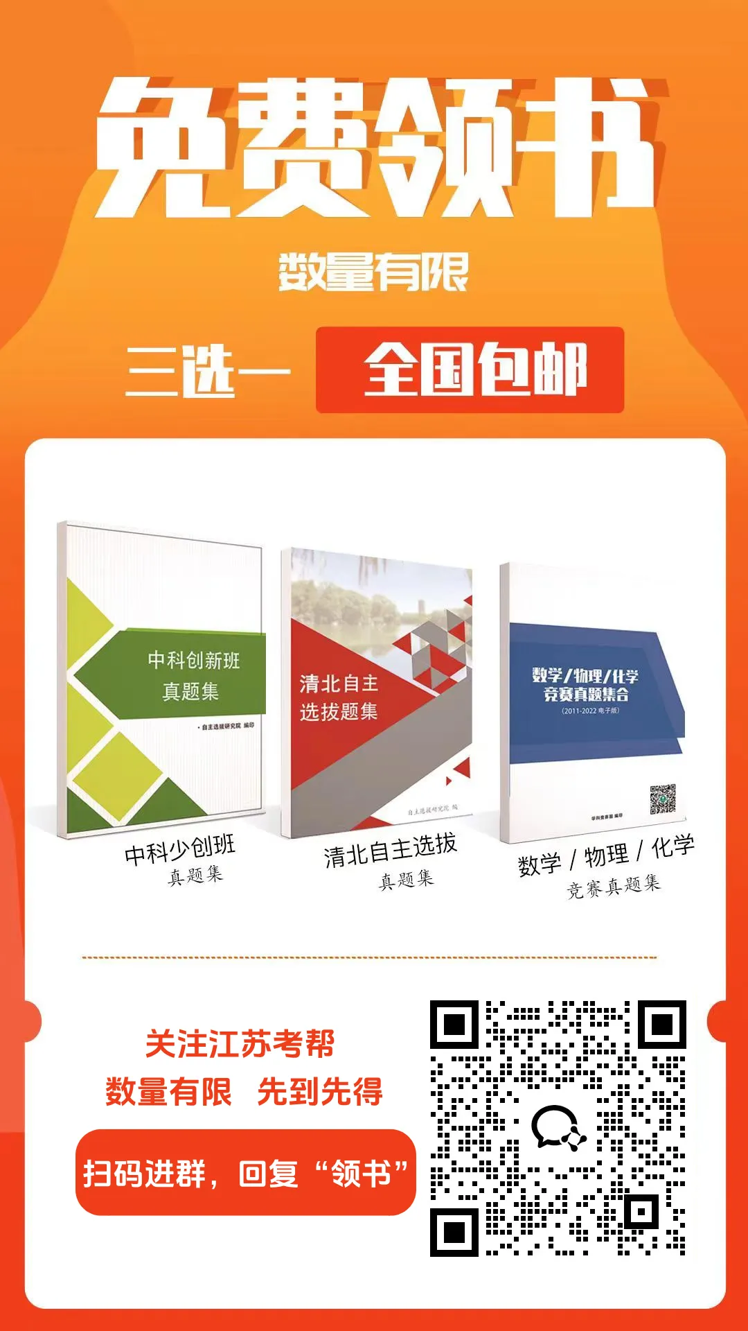 江苏考帮最后有个喜讯告诉大家,为了帮助大家更好地学习竞赛考进清华北大中科大等名校,江苏考帮特意准备了领资料福利:两千本《强基计划红宝书题集》、《清北自主选拔题集》、《科大少/创班题集》免费送!数量有限,先到先得!大家只要把本文分享出去,然后扫码按海报指引流程操作即可。