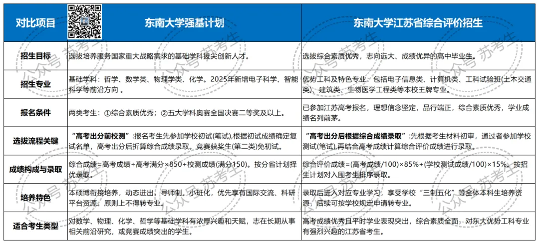 东南大学是既是强基计划招生高校,又是江苏综合评价招生A类高校之一,为学科优势和综合素质全面的考生提供重要升学机会,以下是该校的两项政策对比: