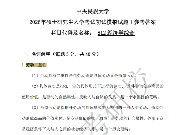 根据考生回忆的考研真题中,名词解释“劳动两重性”、“不变资本”与模拟卷试卷中的一模一样!实现精准覆盖!