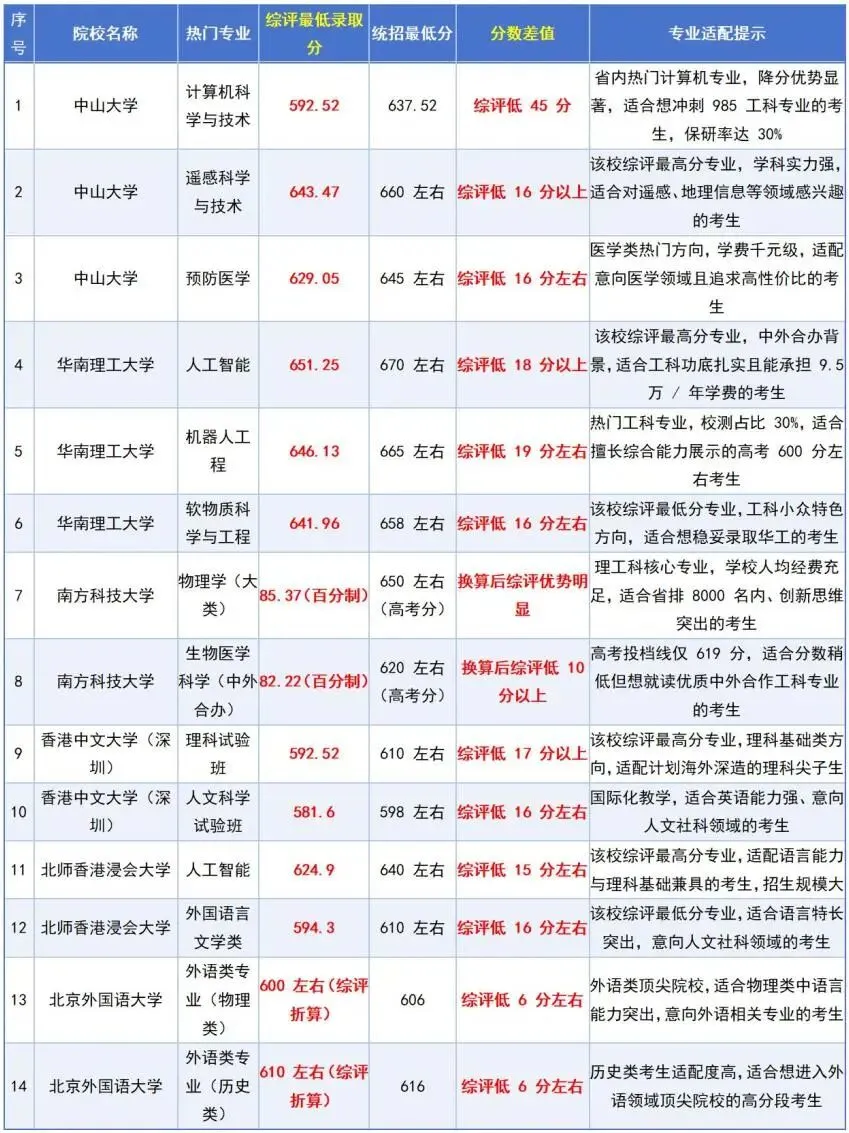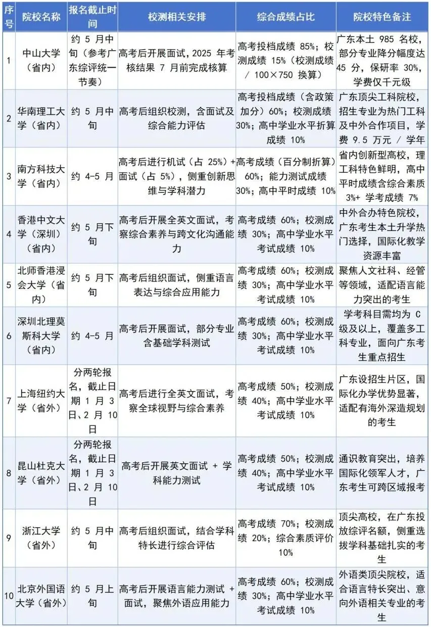 广东地区作为综合评价招生的热门区域,共有 12 所院校参与招生,形成了多元化的院校格局。其中既有中山大学、华南理工大学等 985/211 名校,也有香港中文大学(深圳)、上海纽约大学广东招生片区等中外合办院校,还有南方科技大学这样的创新型高校,覆盖理工、人文、社科、经管等多个学科领域,充分适配广东考生的本土升学需求与发展规划。