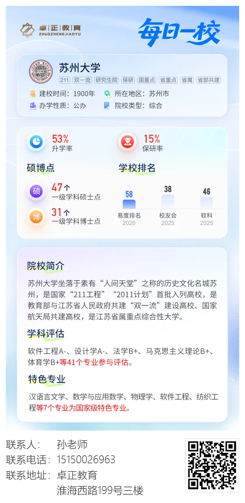 智能择校 | 一键填报 | 智能分析 | 志愿表导出来源 | 文字内容来源于苏州大学官网综合整理。(声明:“卓正生涯”微信公众号刊载此文,是出于传递更多信息之目的。若侵犯了您的合法权益,请及时与我们联系,我们将及时更正、删除。)喜欢本文请分享到朋友圈让更多人看到吧~