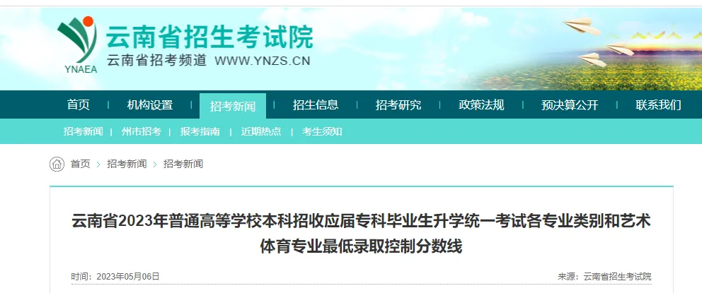 云南省2023年普通高等学校本科招收应届专科毕业生升学统一考试各专业类别最低录取控制分数线