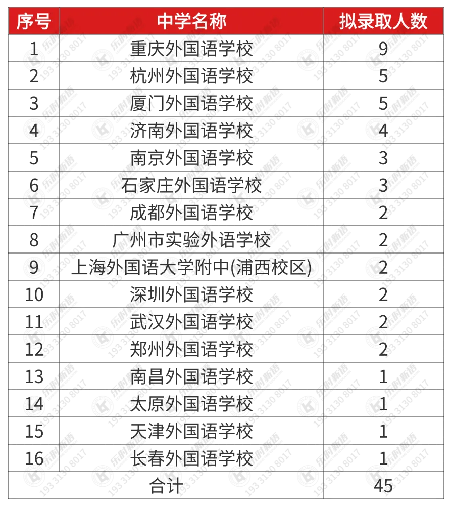 从生源学校来看,重庆外国语学校以9人位居榜首;杭州外国语学校与厦门外国语学校紧随其后,各有5人被拟录取。
