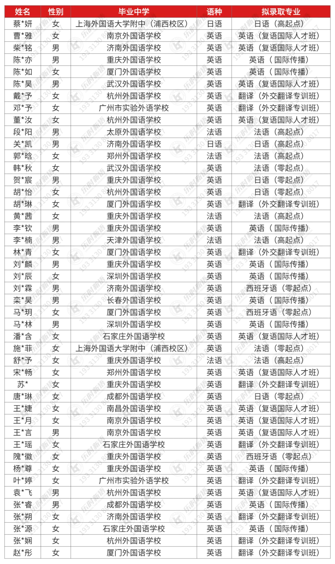 从拟录取语种来看,45人中有英语语种考生38人,法语语种考生5人,日语语种考生2人。