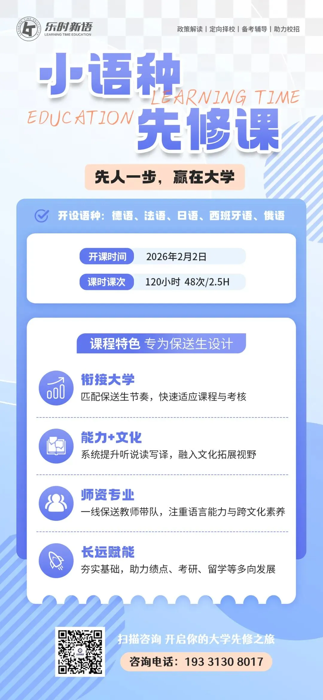 保送成功,提前起跑!乐时新语为26届英语语种保送生,量身打造德、法、日、西、俄多语种先修课。一线名师授课,系统提升语言能力与跨文化素养,助你无缝衔接大学节奏,赢在全新起跑线。名额有限,速来锁定!