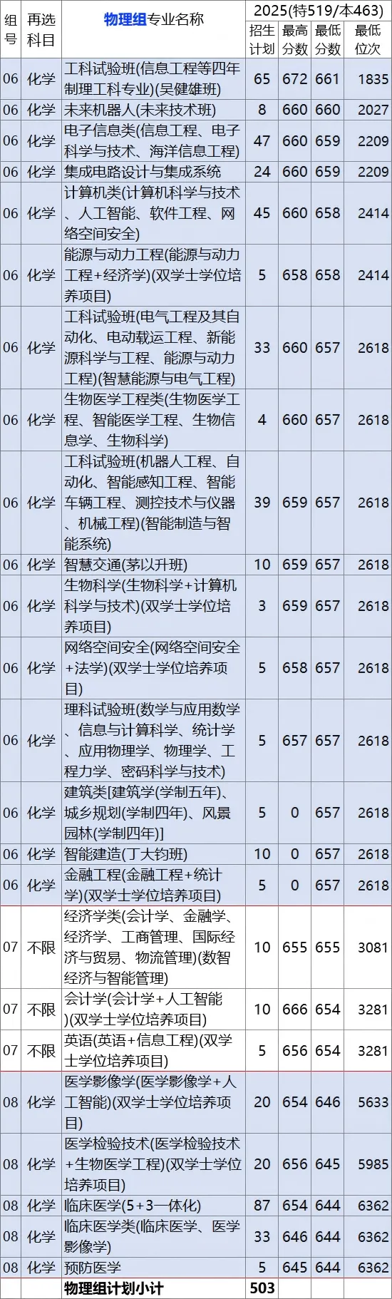 2025年东南大学在江苏录取分数线依旧较高,绝大多数理工医专业需要考生必选物理+化学;仅英语、会计学、经济学类专业要求考生为物理类即可;历史类选科要求为“历史+不限”。