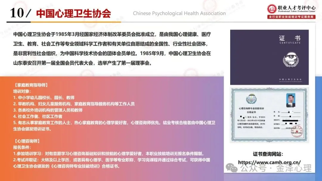 单位介绍:中国心理卫生协会于1985年3月经国家经济体制改革委员会批准成立,是由我国心理健康、医疗卫生、教育、社会工作等专业领域科学工作者和有关单位自愿结成的全国性、行业性社会团体是非营利性社会组织,为中国科学技术协会的团体会员单位。1985年9月,中国心理卫生协会在山东泰安召开第一届全国会员代表大会,选举产生了第一届理事会。证书申请需提交的材料: