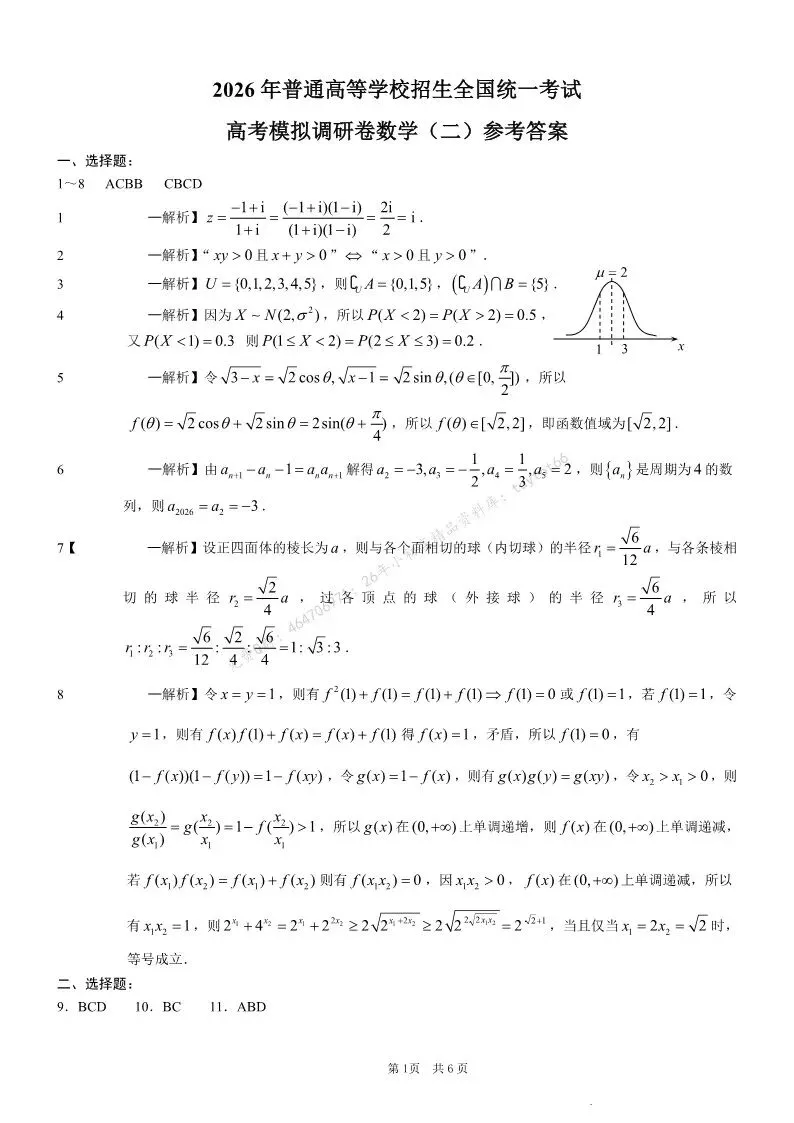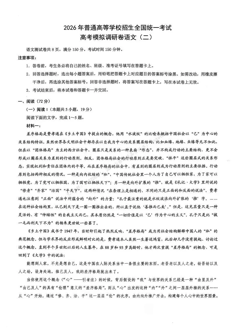 2026年重庆市普通高中学业水平选择性考试高考模拟调研卷(二)(全科)