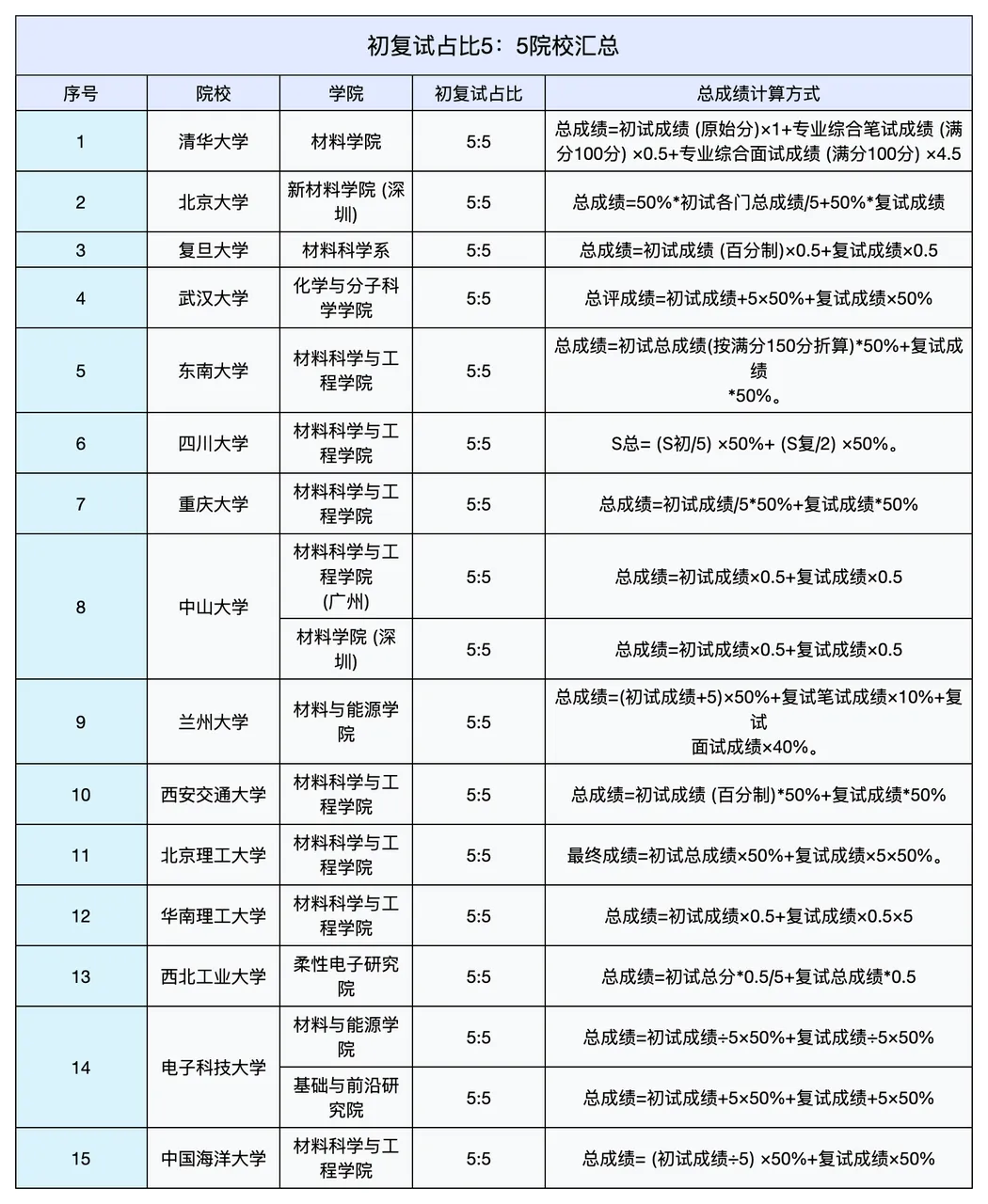 我们已为大家整理出初复试成绩五五开的院校名单,可以直接参考~