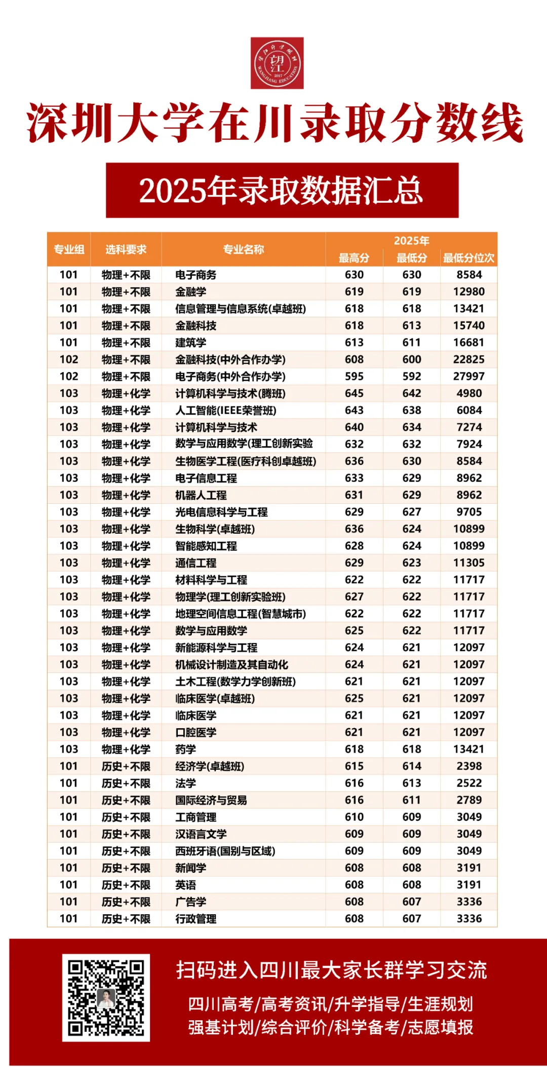 高考志愿规划归根结底就是选大学、选专业、选地域。去一个好的城市读大学,眼光、见识、机会那是无可比拟的。除了经济最为发达的北上广地区以外,深圳是最近几年报考热度崛起的一个城市。今天四川高三指南小编给大家收集整理深圳大学2025年新高考第一年在四川的录取分数线,办学底蕴、培养特色及就业前景,供各位考生和家长选校参考!