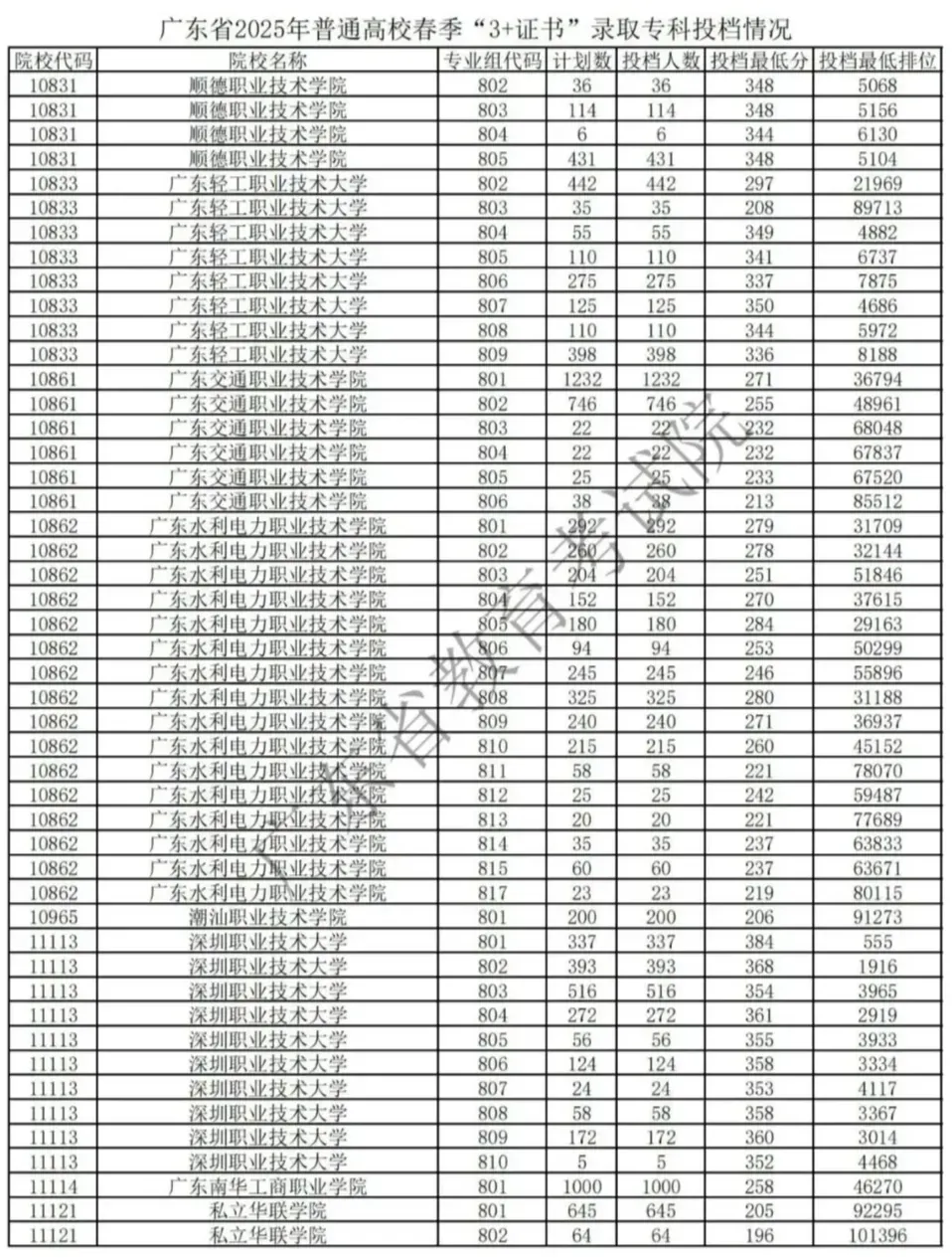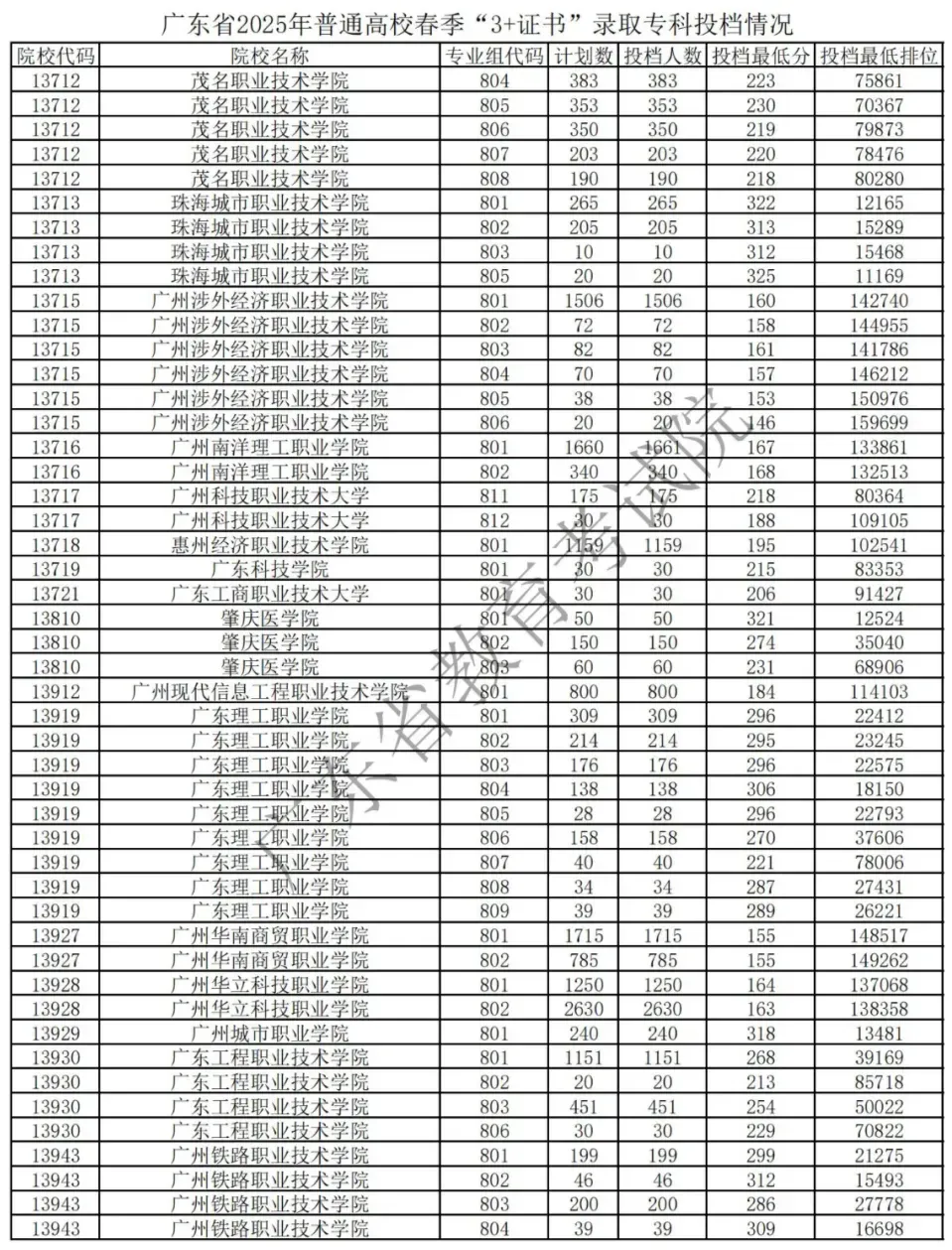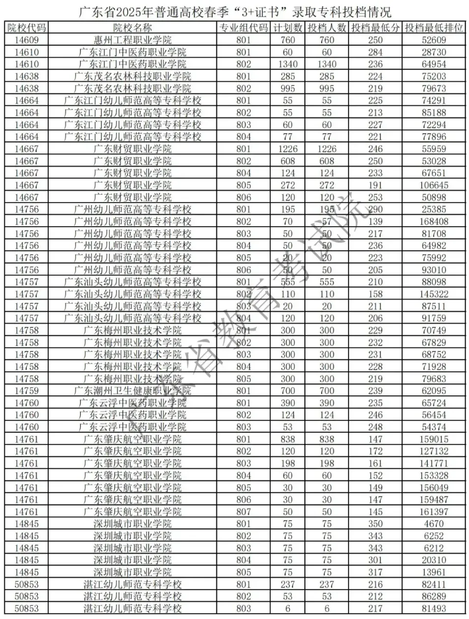 经研究决定,广东省2025年普通高校春季高考(普通高等学校招收中等职业学校毕业生统一考试、高职院校依据普通高中学业水平考试成绩招生录取)招生录取最低分数线如下: