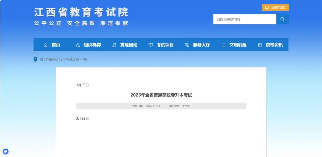 江西省教育考试院已明确,2026 年江西专升本考试定于 3 月 29 日(周日)举行,具体考试时段沿用往年安排: