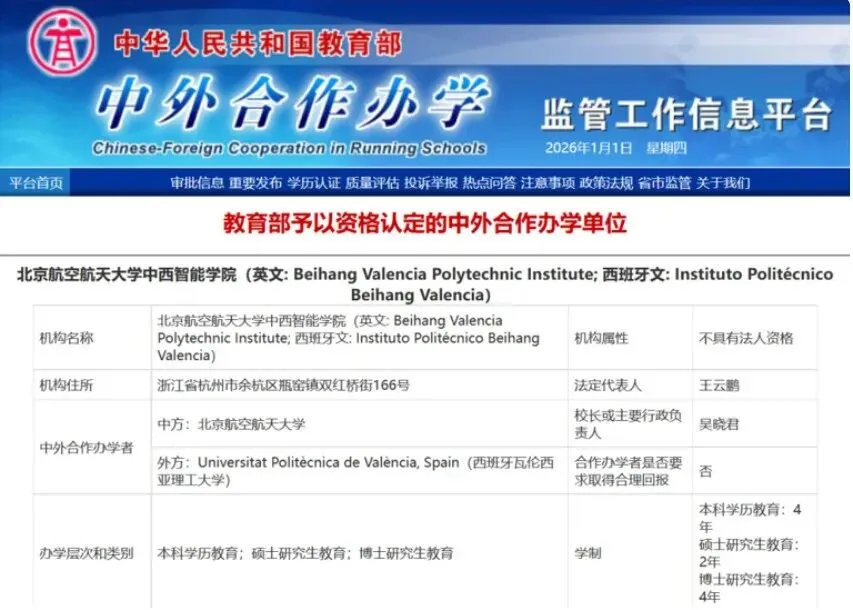 🎯2026开年中外合办院校扩容,人工智能成热门赛道北京航空航天大学、北京外国语大学等近10所在京高校密集发布新增中外合作办学机构和项目,聚焦人工智能、大数据等前沿领域,覆盖本硕博全学段。其中北航新获批的中西智能学院,是国内首个联合西班牙高校设立、覆盖本硕博学历体系的中外合作办学机构,聚焦人工智能、具身智能、制造智能、通信智能等前沿领域,开设机器人工程、智能制造等专业,培养复合型科研人才。