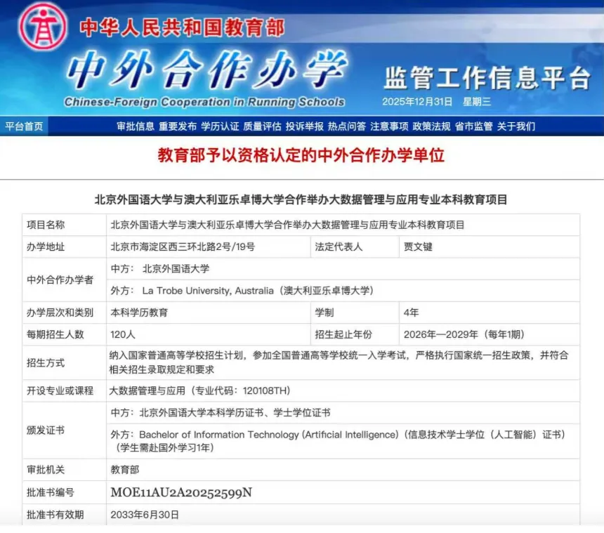 北京外国语大学聚焦“人工智能+大数据+管理”交叉学科领域,和澳大利亚乐卓博大学合办大数据管理与应用专业,今年该专业将招收首批120名本科生,学生在北外完成前两年的本科学习后,再赴澳大利亚攻读双学位。