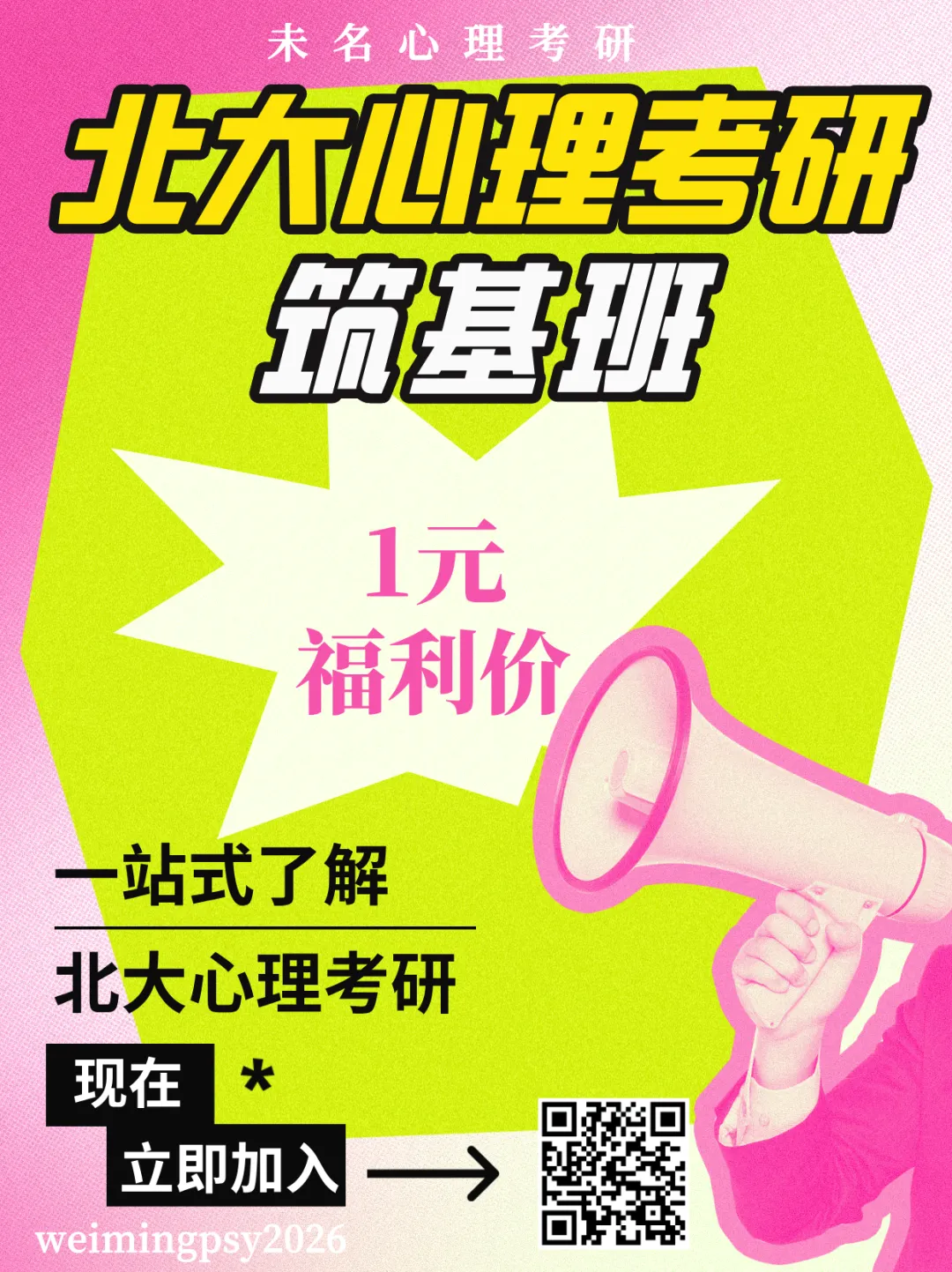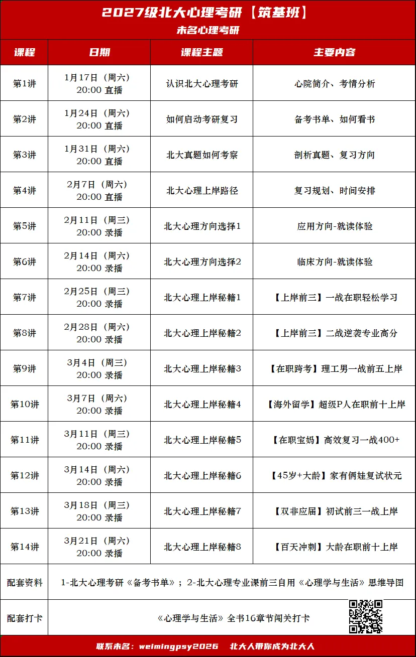 为帮助更多研友走好备战北大心理考研第一步,未名2027级北大心理考研【筑基班】仅需1元,扫描下方二维码即可报名。报名后请添加未名合伙人微信weimingpsy2026加入大部队群,课程通知将在群内发布~