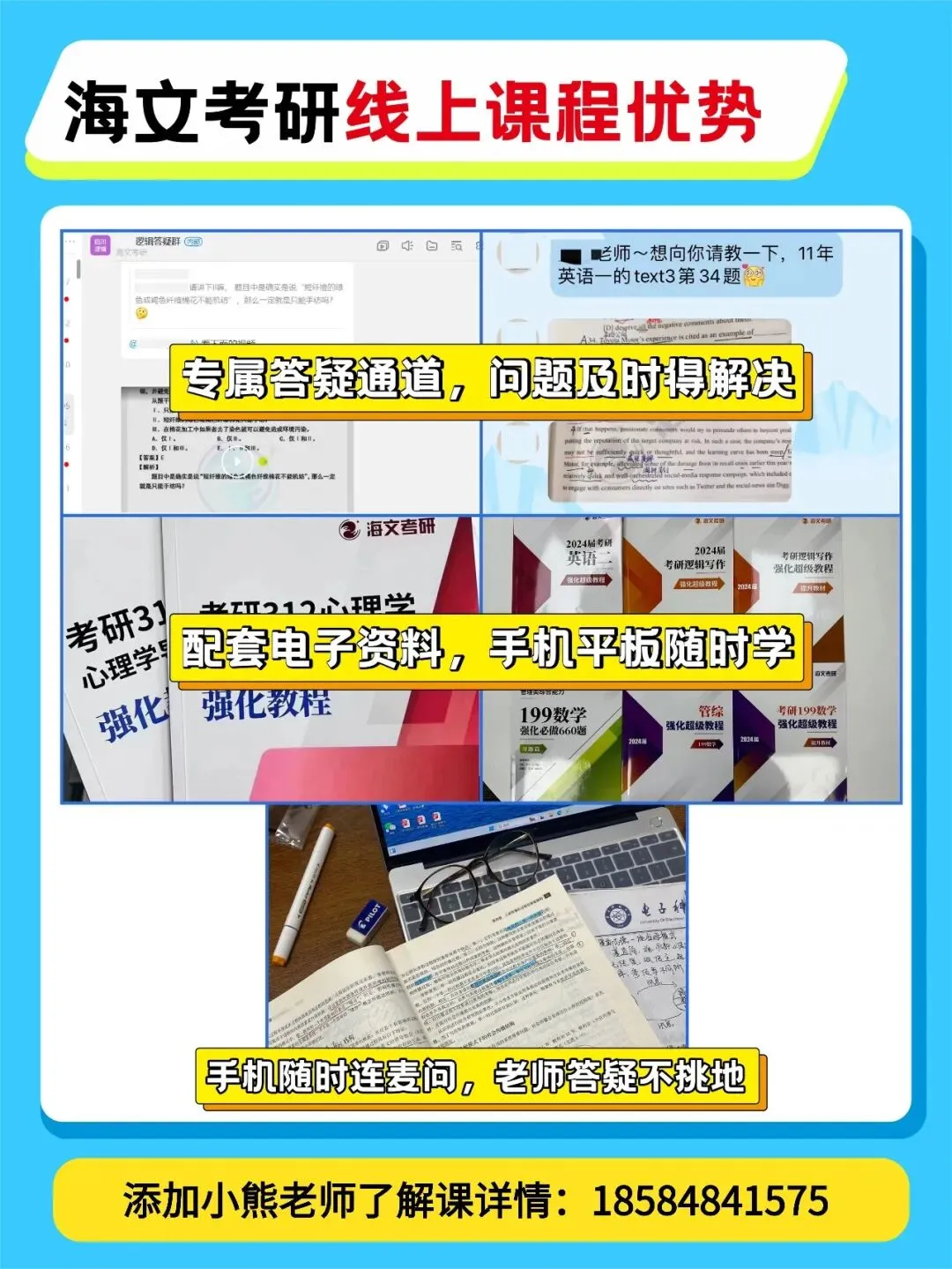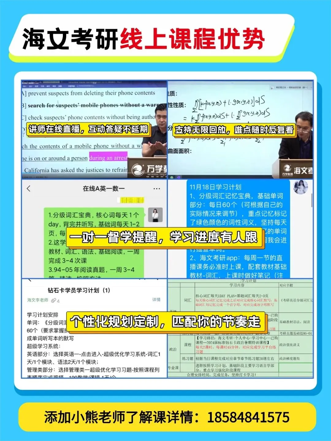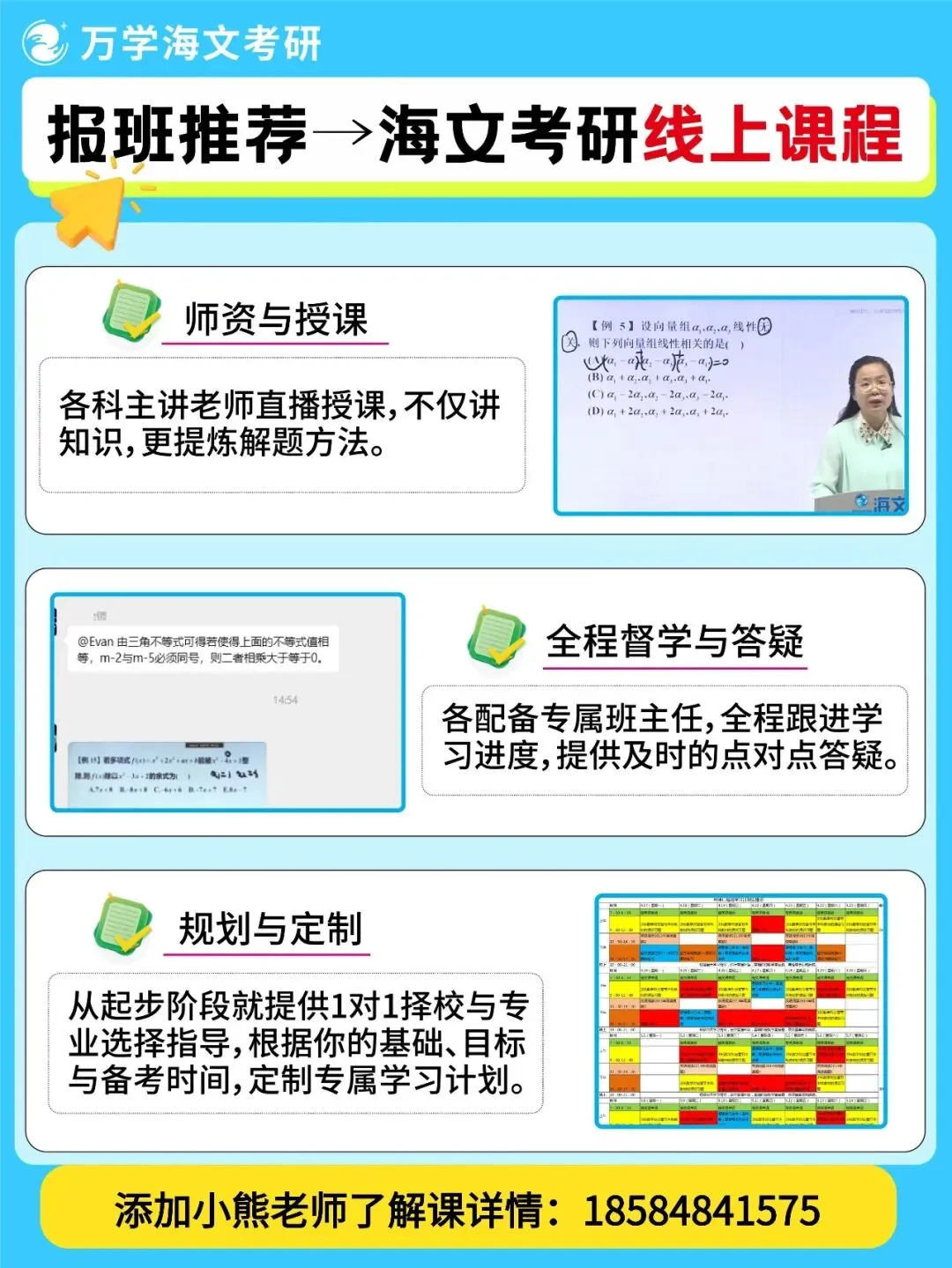线上线下,全科单科均可选择,包含匹配你自身特点的择校择专服务、具体到每个科目的定制化复习计划、各阶段拉网测评及薄弱点锁定突破、专属班主任全程督学等诸多服务。从初试前准备到复试调剂,海文全程精心陪伴你的考研之路!