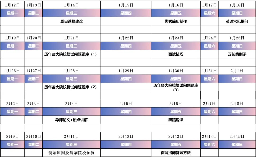 年前时间安排(1月12日-2月13日)