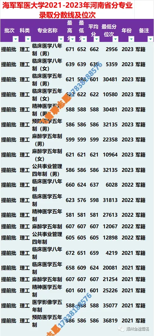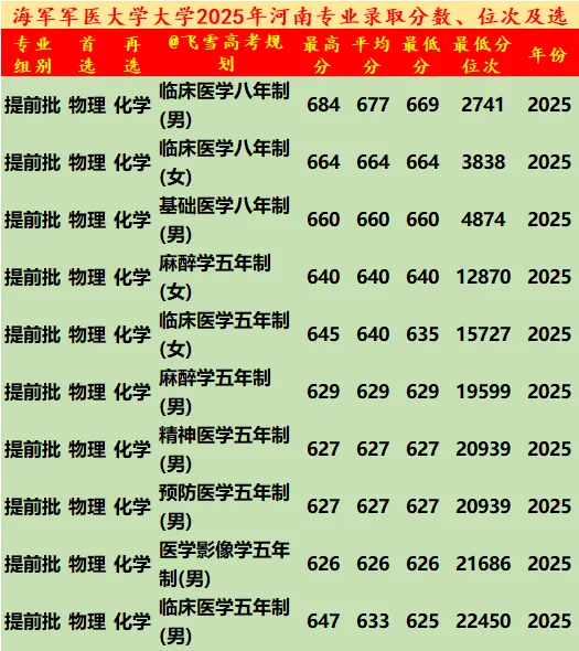 海军军医大学2021-25年河南录取分数线、位次及选科