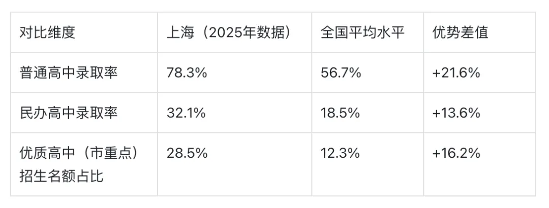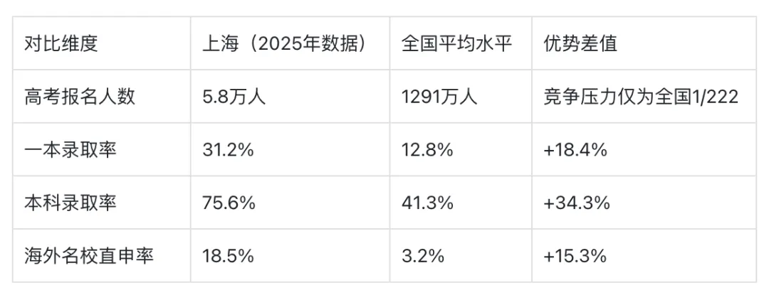 选择在上海接受教育,意味着站在了不同的起跑线上。以下数据客观反映了其在升学阶段的显著优势:它不仅体现在基础教育和网球资源,更体现在中高考的低竞争、高录取,以及海外升学的便捷通道: