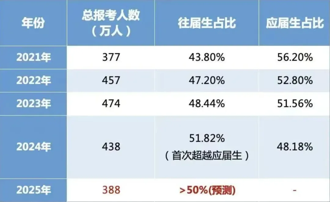 ▲越来越高的往届生比例,考研群体中,除了应届毕业生,还有大量的往届生及在职人员报考。近年来,往届生的占比是逐渐升高,在24考研中占比甚至突破50%!而25考研,往届生考研比例预测超过了半数。▲加之25考研公共课难度上升屡次登上热搜,一批批硕博点又不断增加……就26考研来讲,不管大年小年,考研报名人数大概率只多不少,考研难度只高不低。