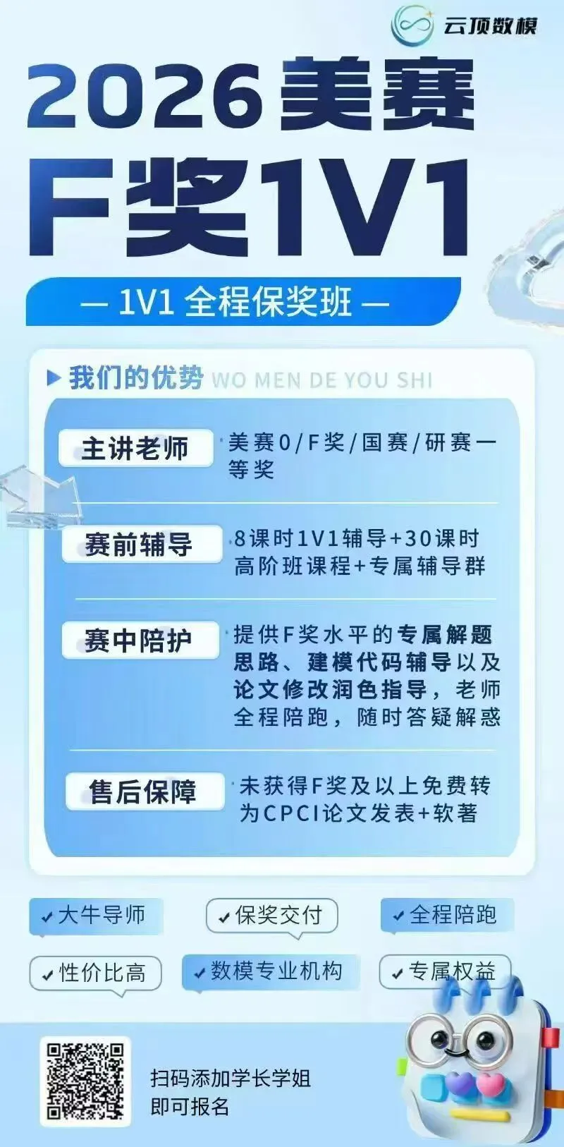 目前有一队美赛奖保奖队伍,缺一人组队,可低价捡漏!!大牛美赛F/O奖老师提供一对一保奖,有需要的同学尽快咨询哟~