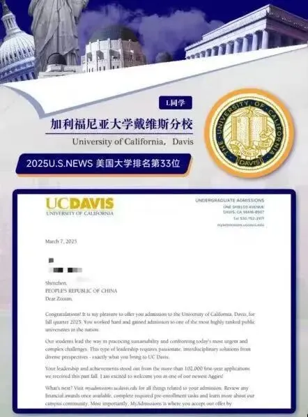 逆袭过程:加入UCPP后,依托“免标化”政策聚焦美高课程,学业管家1对1课外辅导,半年内适应全英文教学。美高阶段完成22个美本学分,GPA维持3.6/4.0,为本科申请奠定扎实基础。2025年成功录取UC Davis(U.S. NEWS #35)本科,L同学感慨:“如果没选UCPP,我可能连美本校门都进不去,更别说拿到顶尖公立大学的录取了。”