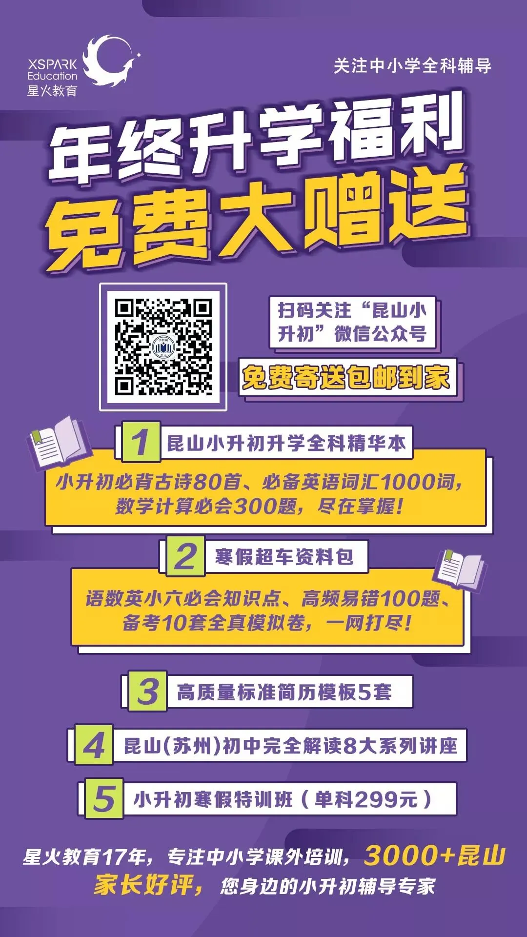 1、《昆山小升初全科复习精华本》:内含必背古诗80首、英语必备词汇1000词、数学计算必会300题2、寒假超车资料包:内含必会知识点整理、高频易错100题、备考10套全真模拟卷5、小升初寒假特训班(单科299元)