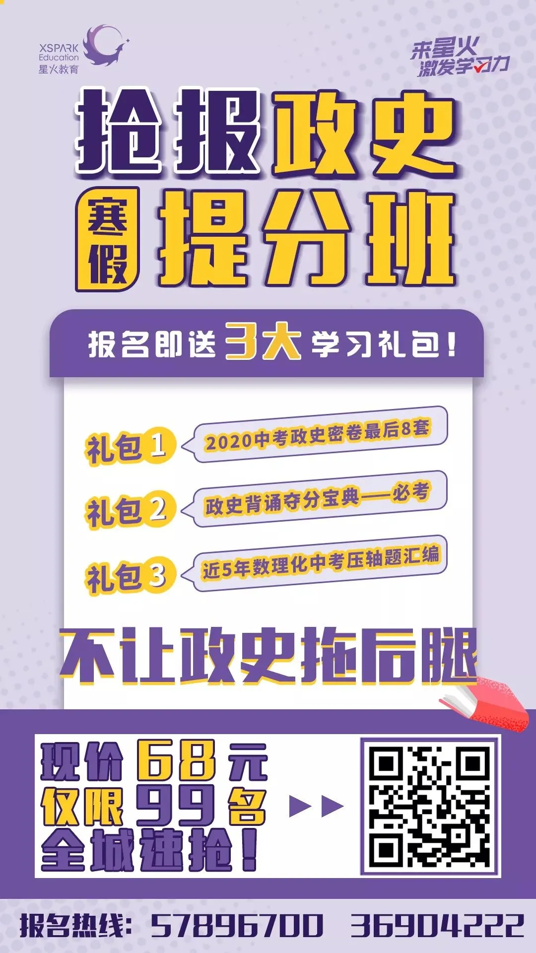 3、更有其它优惠课程,如:新初一0元班(暑假)、中考作文专训班、初三史政冲刺课(68元免费学)、初一寒假预习班、初二寒假预习班、初三寒假冲刺班......