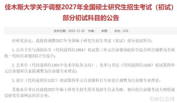 佳木斯大学发布了关于调整2027年全国硕士研究生招生考试(初试)部分初试科目的公告。