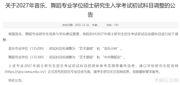 西华大学发布了关于2027年音乐、舞蹈专业学位硕士研究生入学考试初试科目调整的公告。