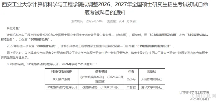 西安工业大学计算机科学与工程学院发布了拟调整2026、2027年全国硕士研究生招生考试初试自命题考试科目的通知。