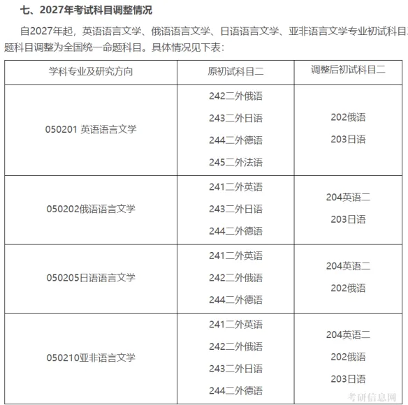 自2027年起,英语语言文学、俄语语言文学、日语语言文学、亚非语言文学专业初试科目二由自命题科目调整为全国统一命题科目。