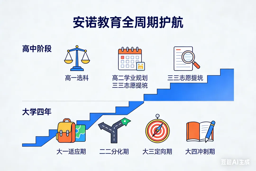 安诺教育打破“单一填报服务”局限,打造“高中-本科-研究生”全周期升学规划体系,适配2026年高校人才培养改革与多元升学需求,从源头助力考生长期发展: