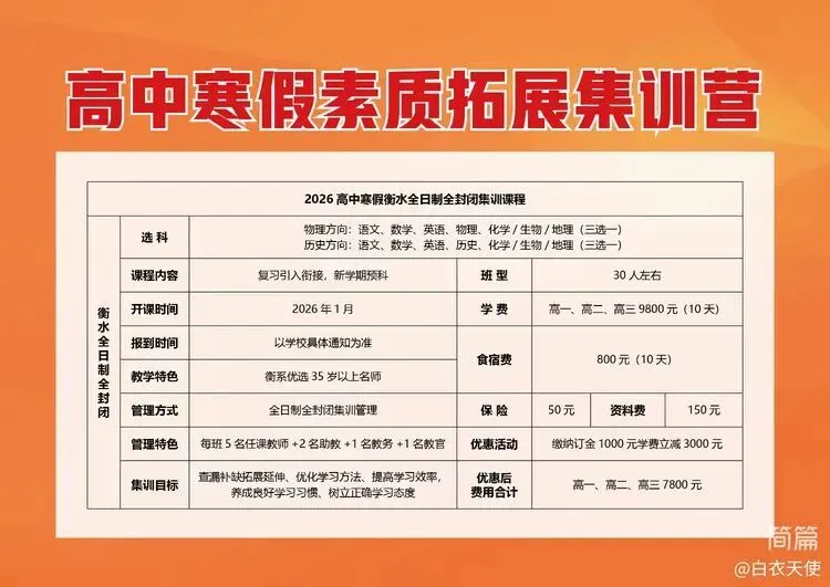 针对初高三学生,衡水金衡推出寒假突击班优惠活动:缴纳订金1000元,学费立减3000元。优惠名额有限,有意向的学生及家长可尽快咨询报名,抓住假期提分机会,为中高考打下坚实基础。