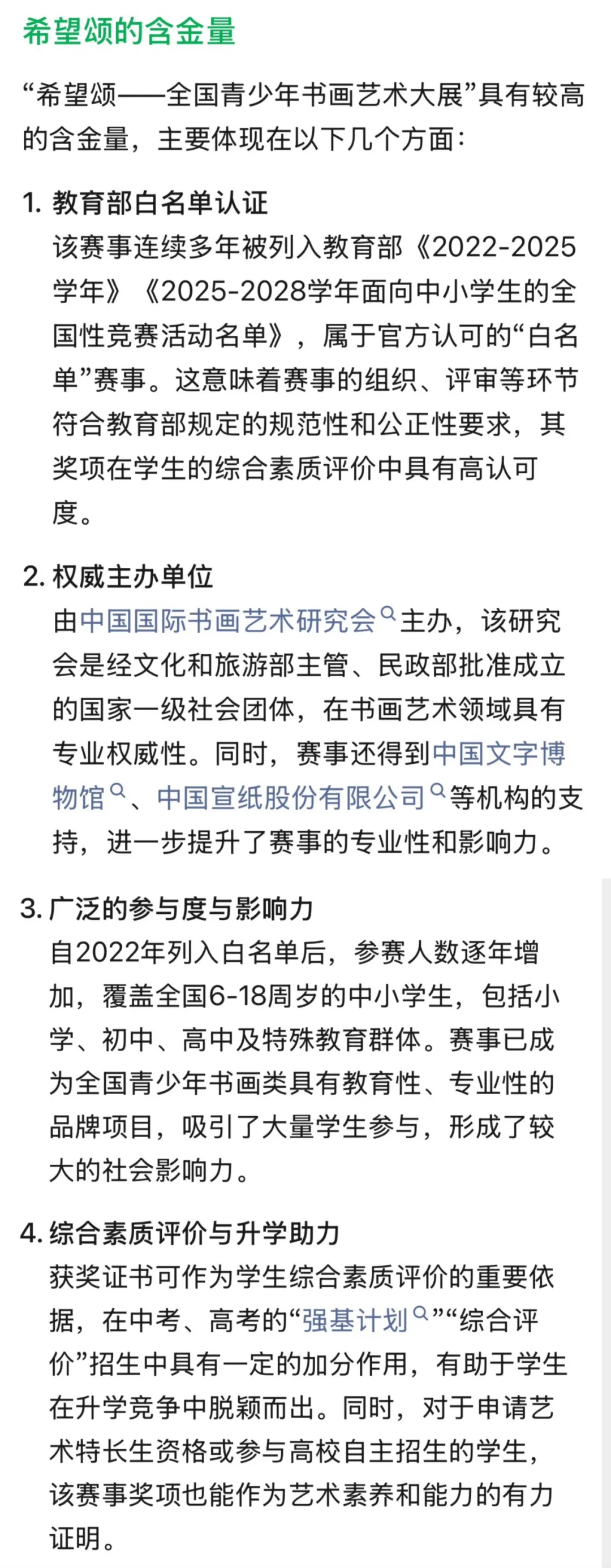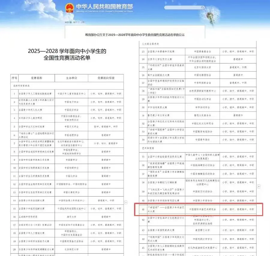 中国国际书画艺术研究会是由中华人民共和国文化和旅游部主管,经中华人民共和国民政部批准成立的国家一级社会团体组织。由本会主办的“希望颂——全国青少年书画艺术大展”,已经连续成功举办了九届。自2022年列入教育部《2022-2025学年面向中小学生的全国性竞赛活动名单》后,参赛人数越来越多,影响力、公益性、权威性越来越显著,已逐渐成为全国青少年书画类具有教育性、专业性的品牌项目。2026年又被列入教育部《2025—2028学年面向中小学生的全国性竞赛活动名单》,为规范有序地搞好第十届“希望颂”大展,特发布征稿启事。