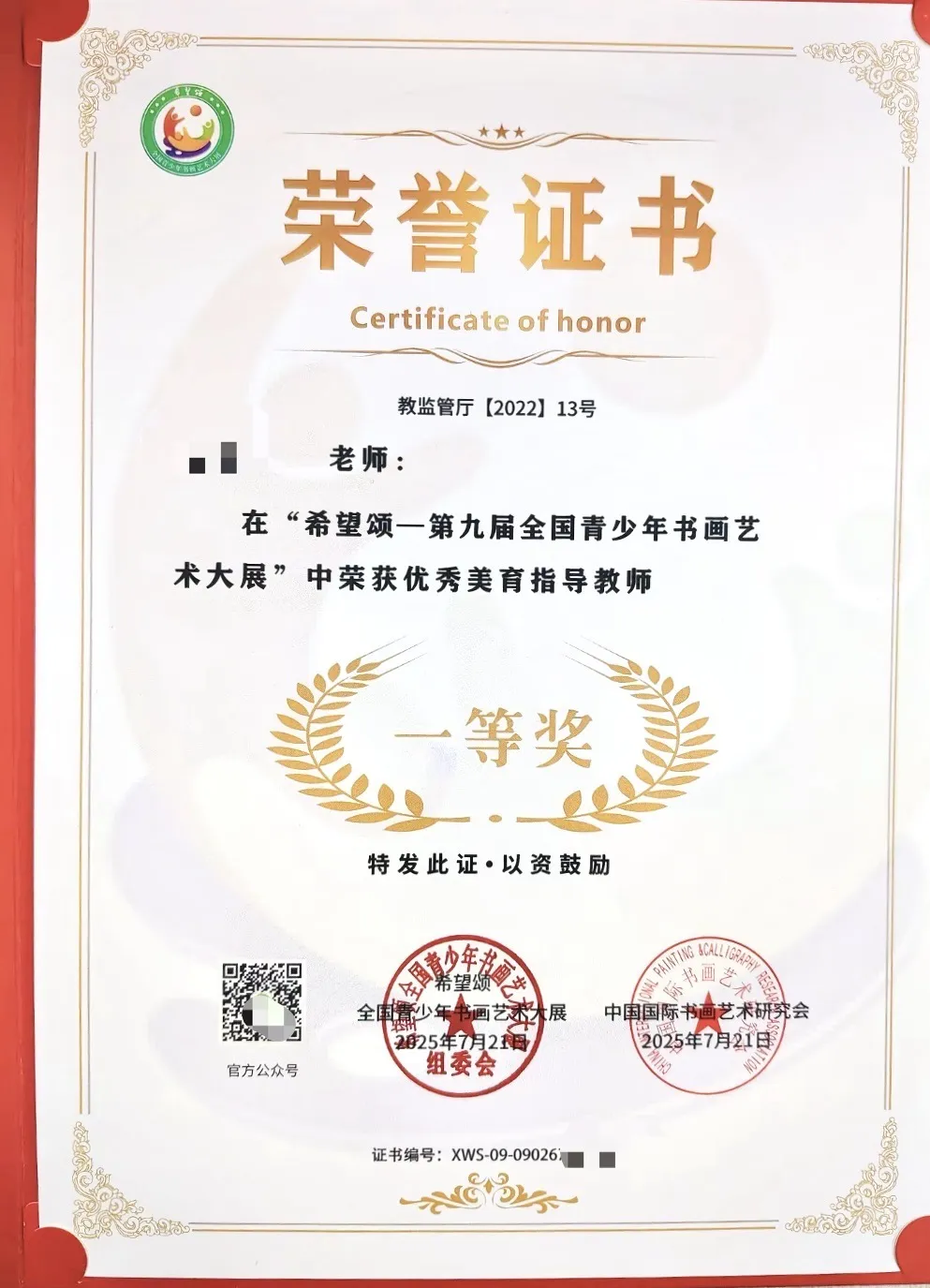 (三)优秀美育指导教师奖。希望颂大展活动中,每名教师至少辅导20名学生参赛,参赛学生中有1名一等奖获得者或2名二等奖获得者,总获奖学生不低于15名,可获得优秀美育指导教师奖。