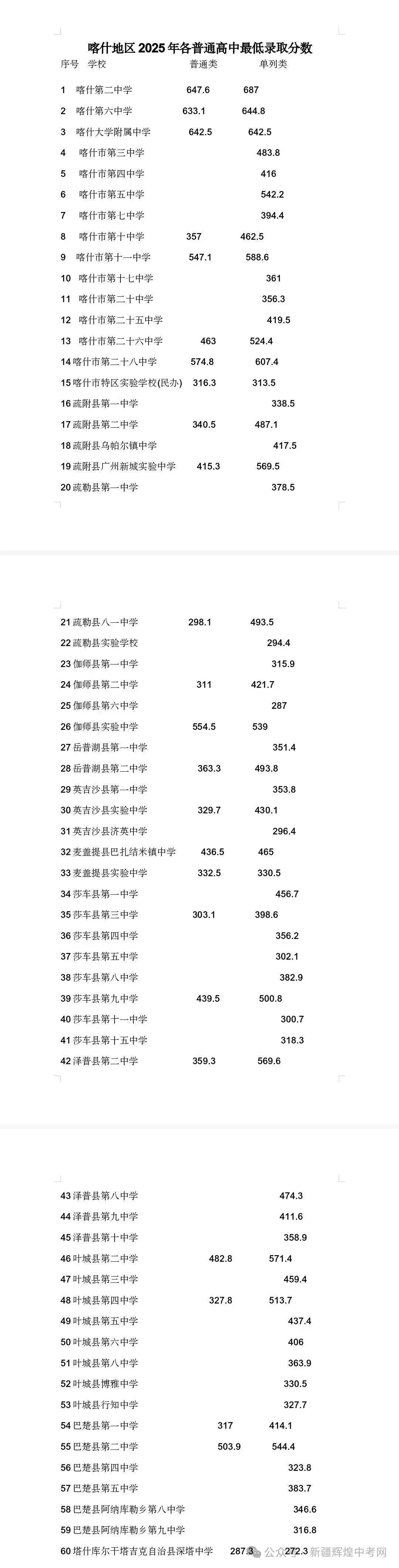 根据《喀什地区2025年普通高中招生工作方案》相关安排,喀什地区2025年普通高中招生录取工作已经完成,现将录取有关情况公告如下:一、录取原则喀什地区2025年普通高中招生录取在网上录取,按照分数优先、遵循志愿的原则,根据成绩由高分到低分录取,至计划完成为止,考生总分相同时,录取按语文、数学、外语、物理化学(合卷)、道德与法治历史(合卷)、体育六科总成绩排列,确定投档顺序。二、2025年喀什地区普通高中招生录取工作已完成,以下是各批次及部分学校的最低录取分数线: