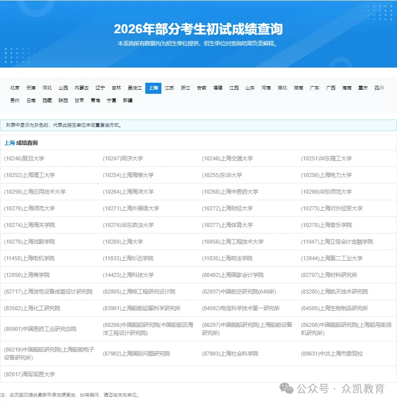注意啦!现在研招网列表里的院校名字还是灰色的,这说明查分通道还没开哦~等这些名字变成可点击的黑色,就意味着考研成绩要和大家见面啦!到时候直接点自己的目标院校,输入姓名、证件号、准考证号,就能查到分数啦!