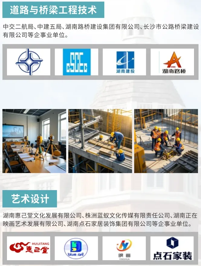 全国师范生教学技能大赛等赛事中表现亮眼累计获得国家级奖项3项、省级奖项32项,彰显过硬专业技能。毕业生年均就业率超91%,近三年获中国建筑五局、湖南路桥集团等头部企业录用超600人,用人单位满意度连续三年保持100%。