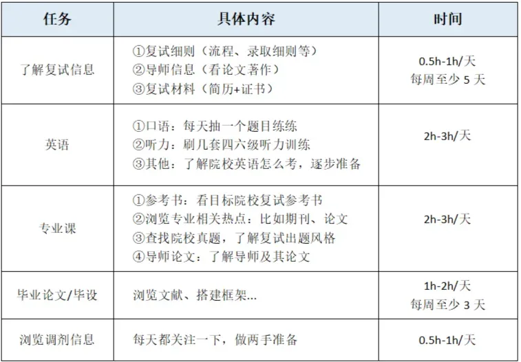 复试考察的内容,还是比较广泛和全面的,先给大家分享一份任务清单👇主要任务涉及到了解复试信息、英语复习、专业课复习,以及准备毕业论文/毕设、浏览调剂信息,当然也包括了制作简历、联系导师、自我介绍、面试模拟等细节。而复试内容中,像制作简历、联系导师、自我介绍,基本1~2天就可以搞定,最重要的也是最难的,就是及时了解复试信息、复习专业课、提高英语能力这三方面。不管复试形式是线上还是线下,复试考察内容、范围和标准一般不会和往年有太大的差异,先按照往年的准备起来。同学们也可以通过微博、贴吧等找到学长学姐,咨询他们复试的具体情况,比如大概复试流程,复试参考书,复试注意事项等