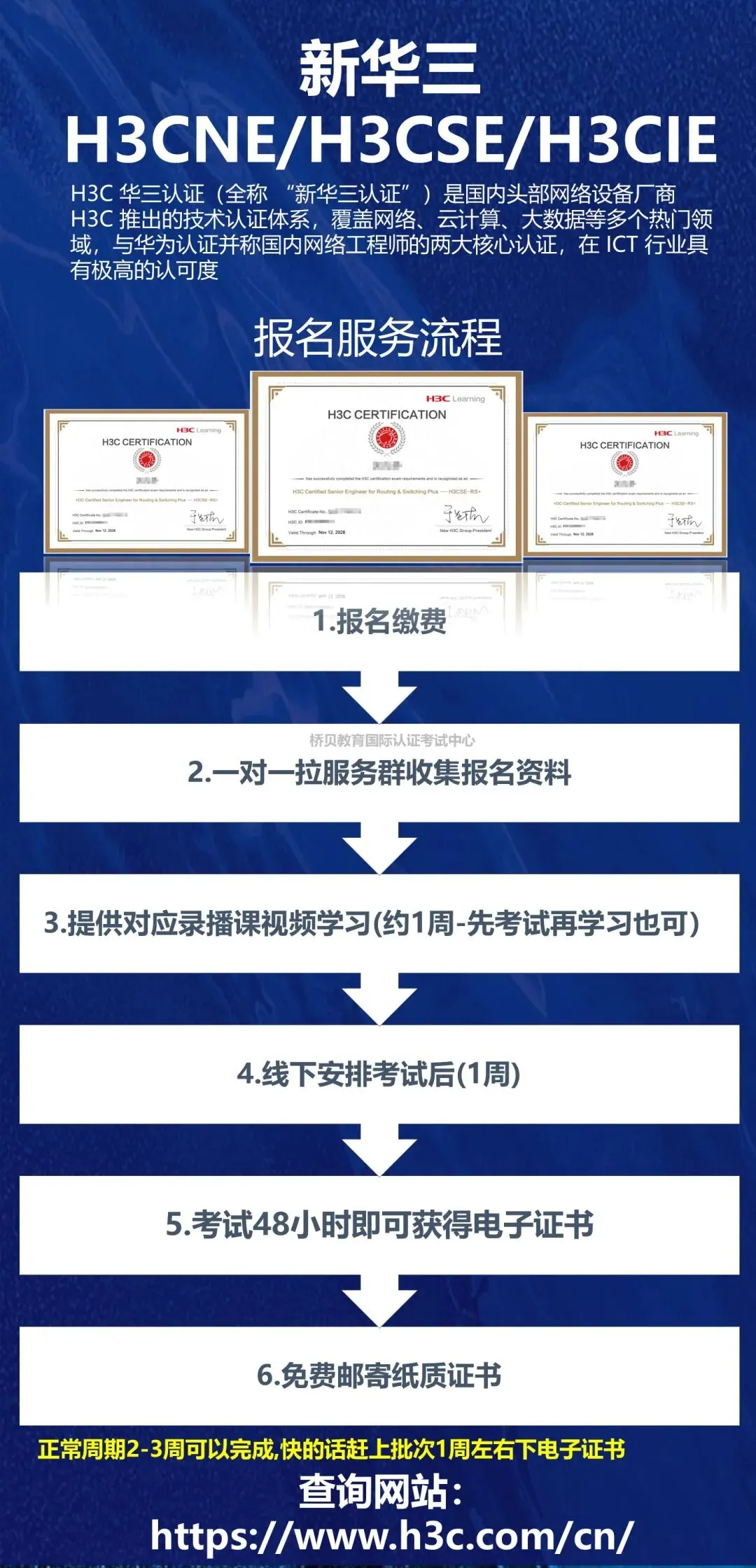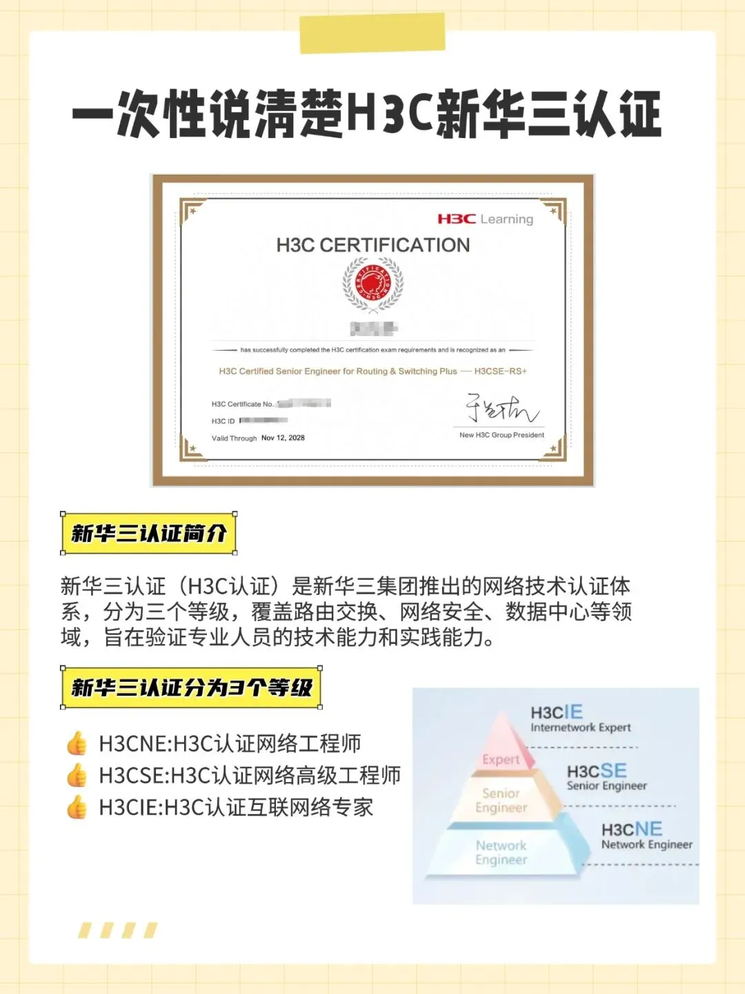 备考建议:H3CNE/H3CSE 系统学习 1-2 周通过率较高,考试当场出成绩,需妥善保管纸质成绩单。