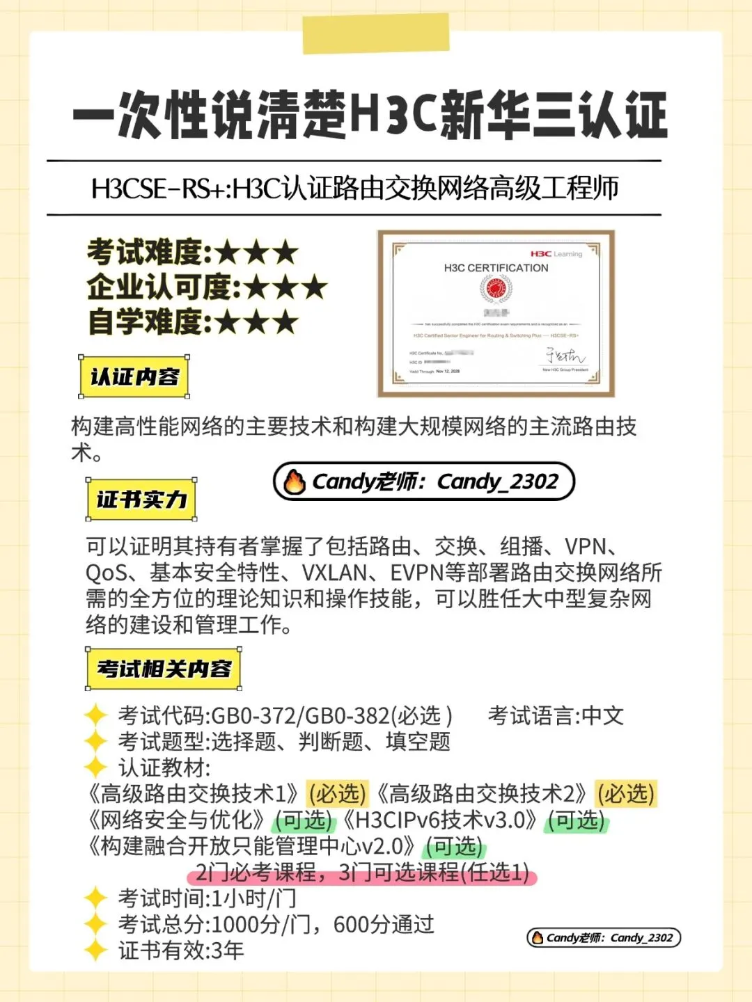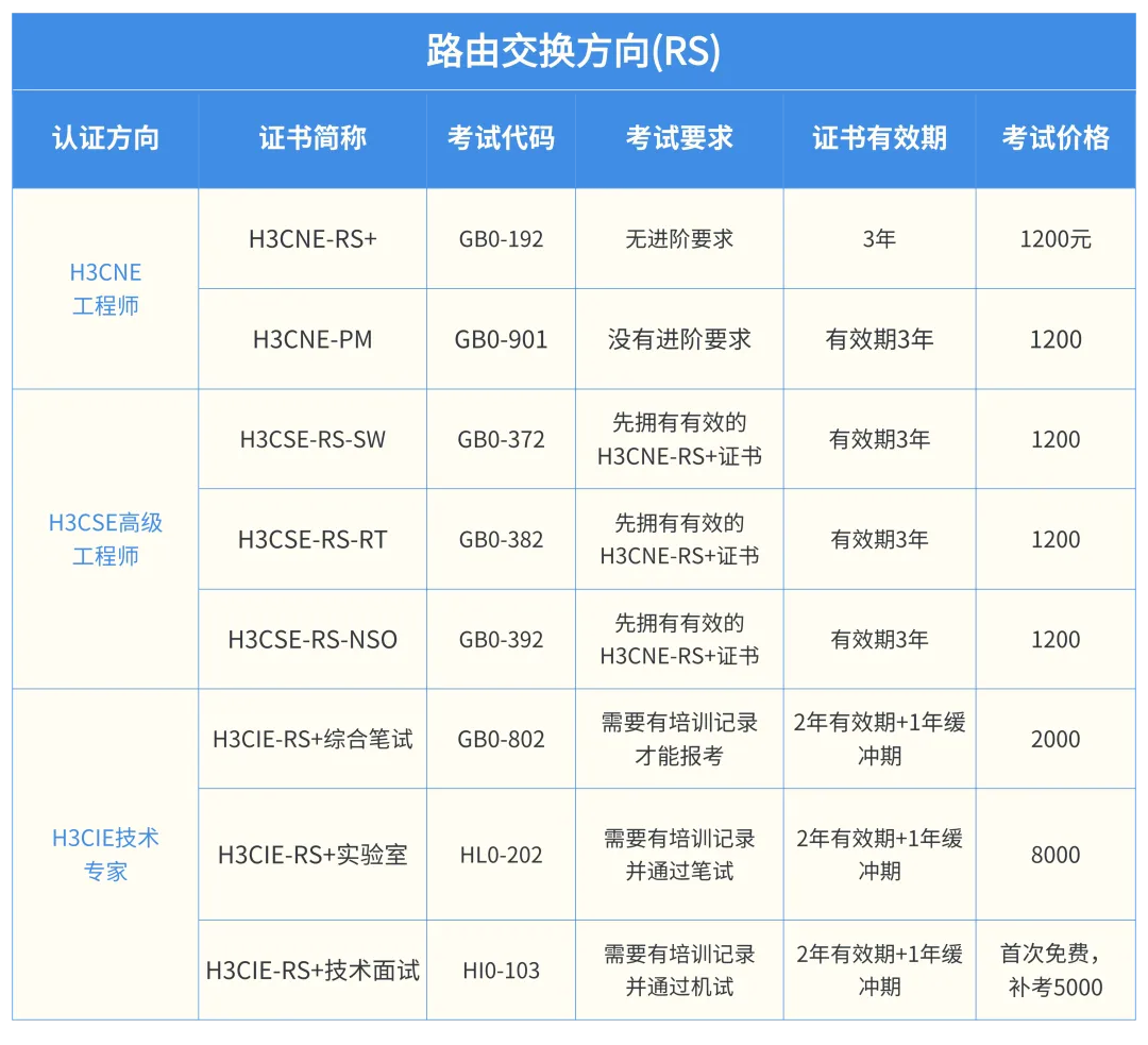 进阶级:H3CSE-RS-SW(GB0-372)、H3CSE-RS-RT(GB0-382)等,需持有有效 H3CNE-RS + 证书,有效期 3 年,单科 1200 元;