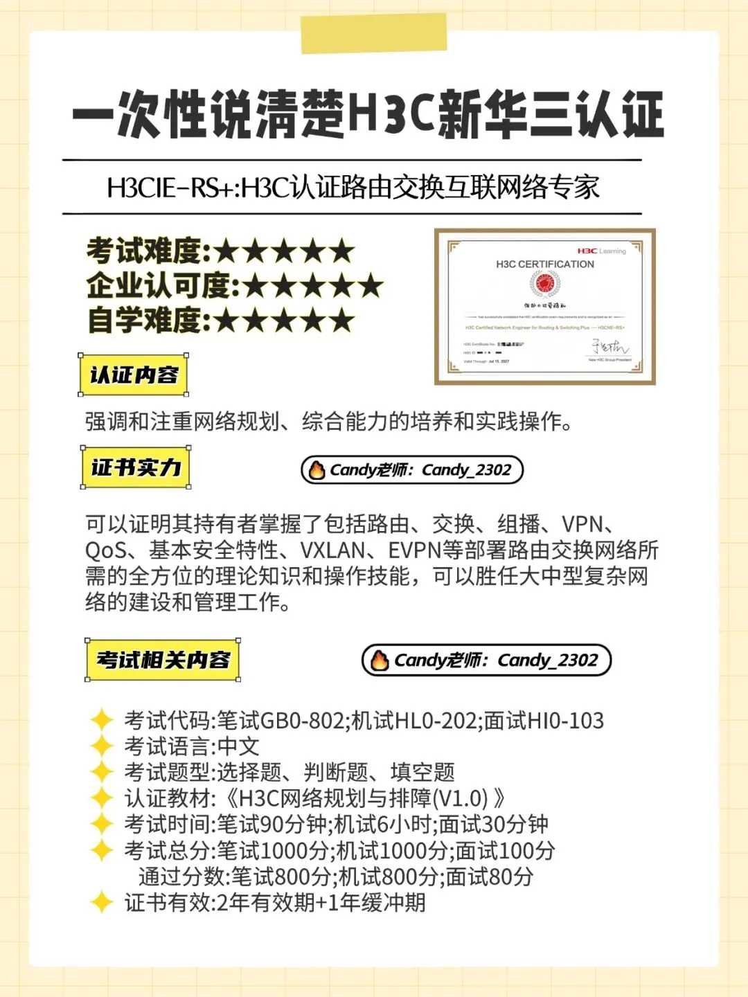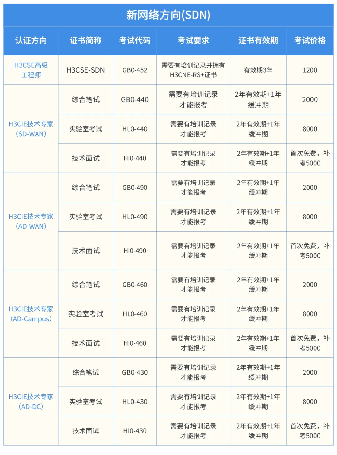 专家级:H3CIE-RS + 需通过综合笔试(GB0-802,2000 元)、实验室考试(HL0-202,8000 元)、技术面试(HI0-103,首次免费,补考 5000 元),证书有效期 2 年 + 1 年缓冲期。