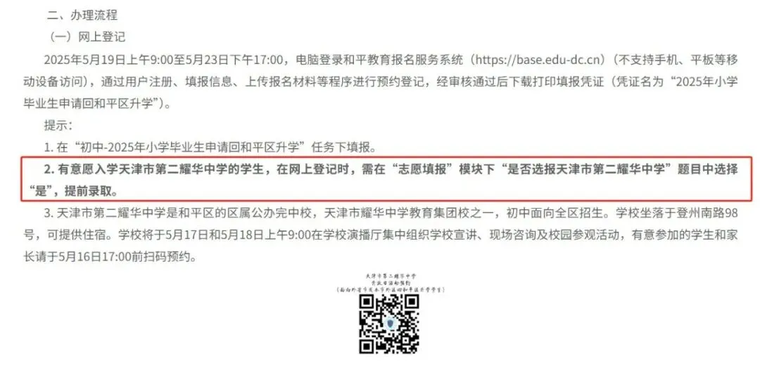 在网上登记时可以选报二耀华中学提前录取(可住宿),不报名提前录取的其余学生,在和平区小学毕业生派位录取后,填报升学志愿,可以派位录取在全区有空余计划的学校,见下面通知。