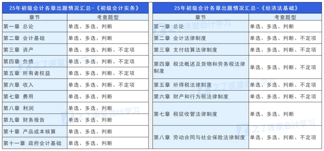 之了课堂初级教研组老师为同学们整理了25考季试题中各章题型考察情况,同学们可以参考下图内容,多加针对练习。