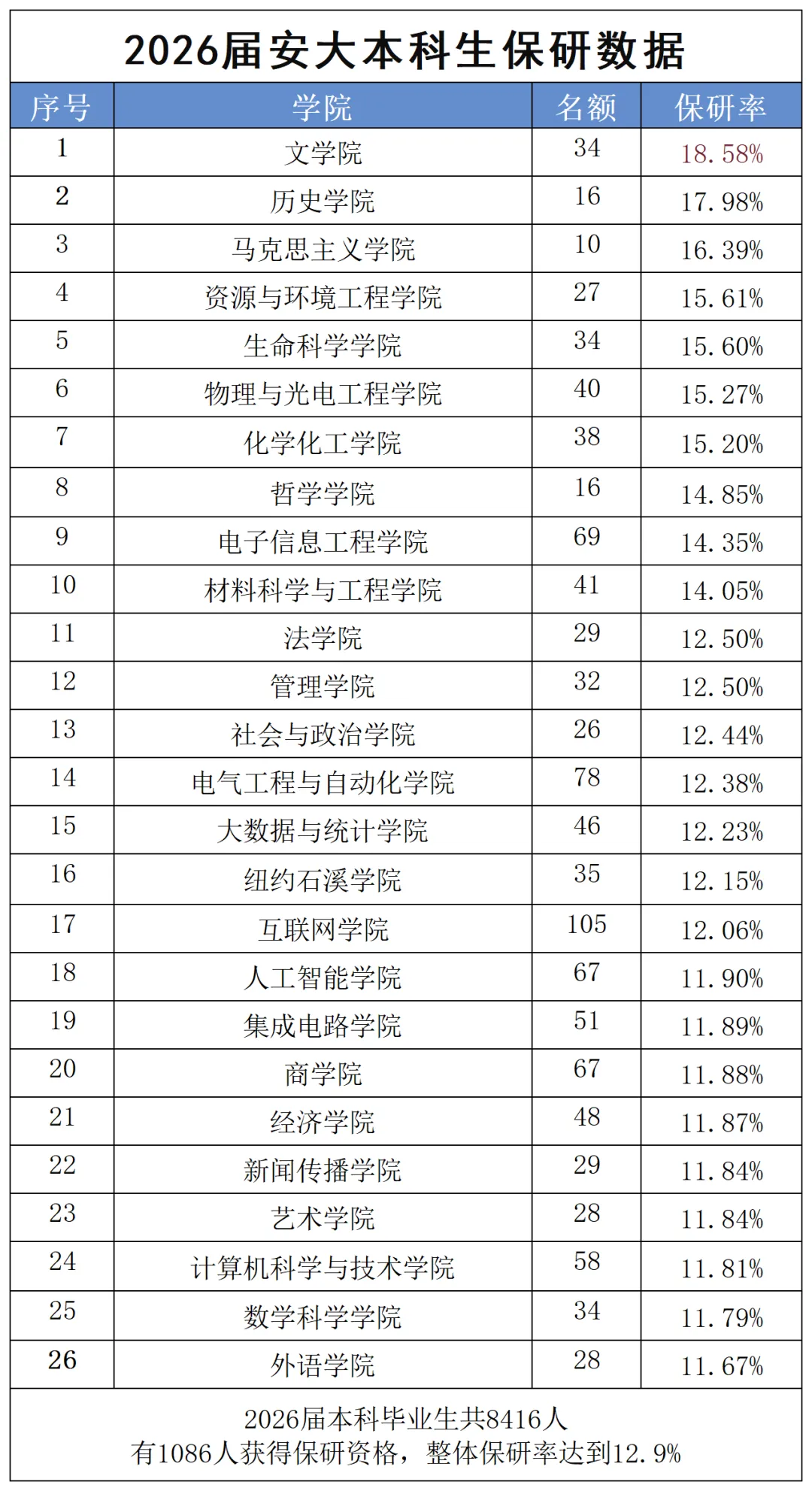 整体来看,安徽大学2026届本科毕业生共8416人,保研资格人数1086人,整体保研率12.9%,在安徽省内“双一流”高校中处于中等水平(中科大、合工大保研率更高)。