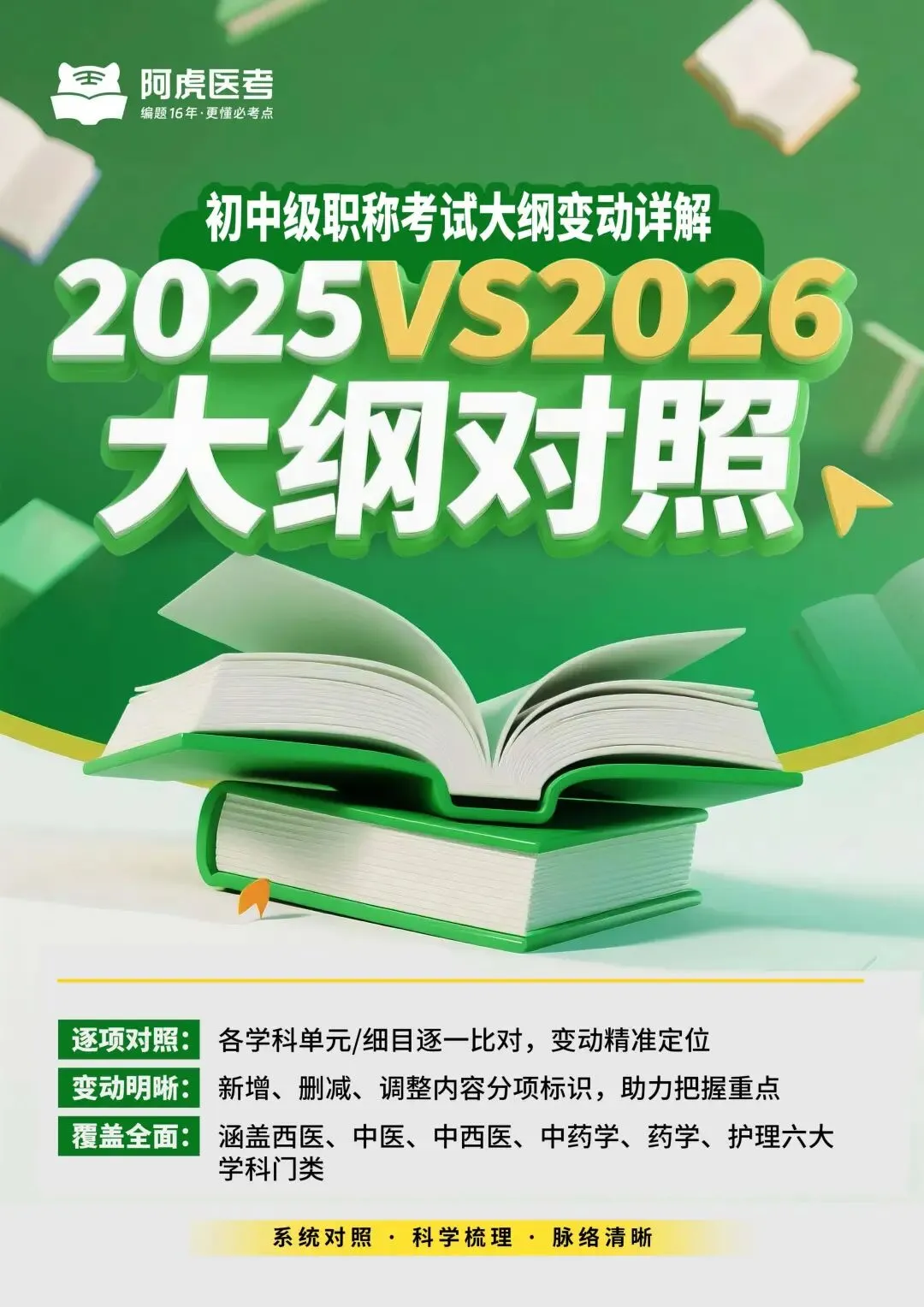 2026年初中级职称考试大纲发布后,我们的教研老师第一时间就投入到新旧大纲的比对工作中,逐字逐句梳理,最终整理出了这份《初中级职称考试大纲变动详解(2025 VS 2026大纲对照)》资料。它覆盖了西医、中医、中西医、中药学、药学、护理这六个大家常考的学科门类,每个学科的单元、细目都拆解开做了详细对照。